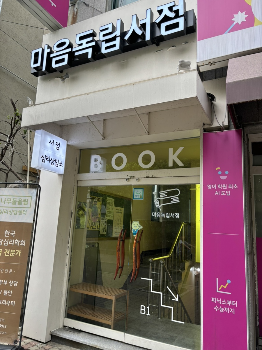 마음독립서점은 지하 1층에 위치해 있다. 내려가는 길에 아주 친절한 설명과 아로마 향이 참 좋았다. 주차는 잠시 은구비공원 쪽에 해 두었다.