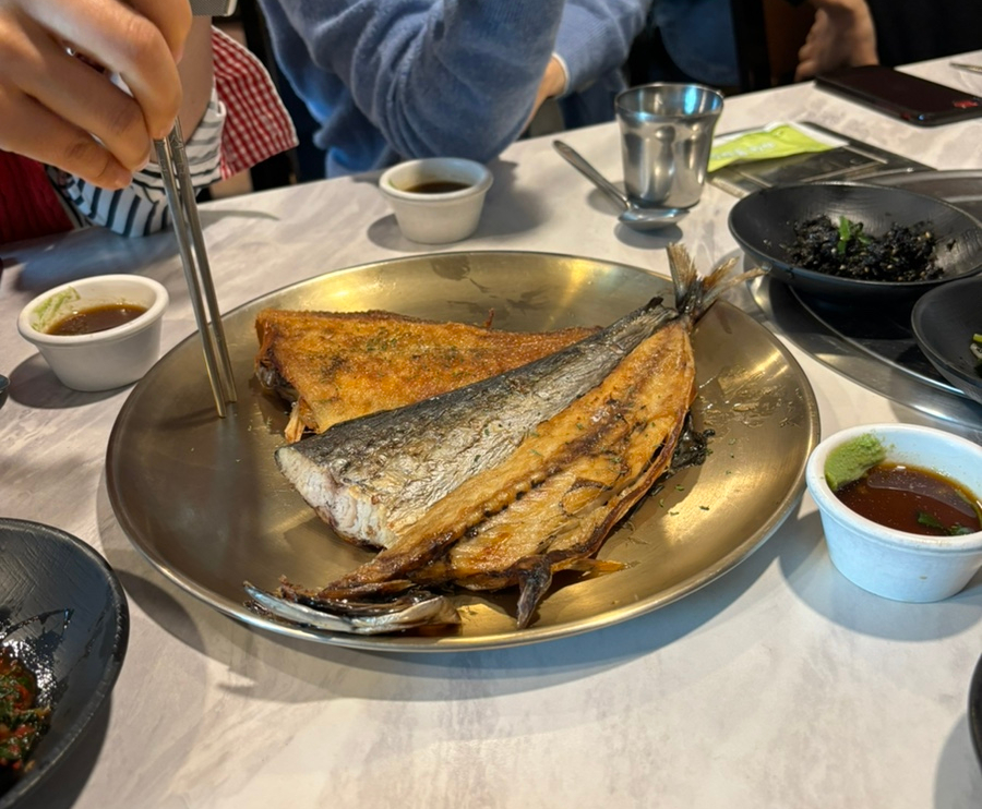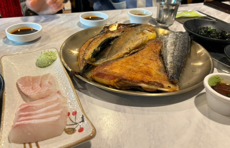 (3인) 삼치/조기/가자미/고등어 그리고 맛보기 숙성 광어회 100g이 나왔다. 숙성 광어회는 7점 정도가 나오는데 가격이 좀 있는 편이다. 숙성되어 부드럽고 깊은 맛이 괜찮았다. 생선구이와 회를 파는 집이라니! 은근 자주 대전에서도 생선구이집을 갔었는데... 집에서 구워 먹기 워낙 어렵기 때문이다. 대전에서 가장 맛있는 생선 구이집이었다!