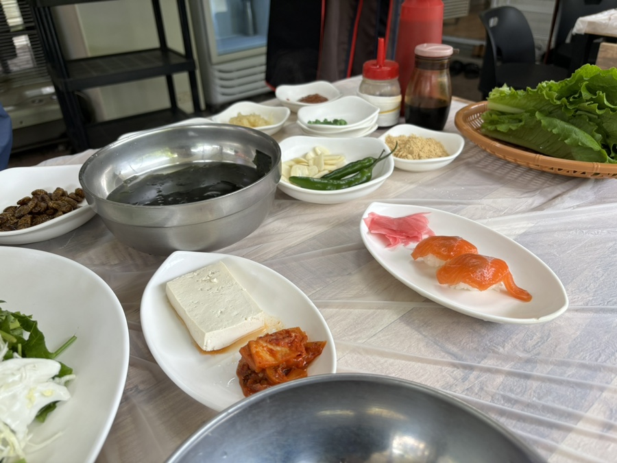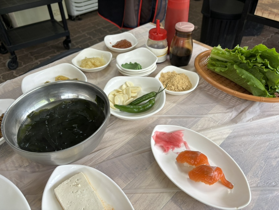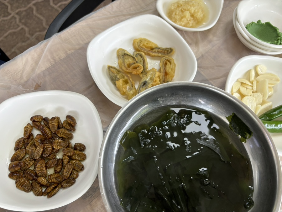 추억이 되어버린 번데기와 송어탕수 맛보기, 미역국, 쌈장, 와사비, 콩가루, 간 마늘, 참기름, 간장, 고추장 등이 나온다.