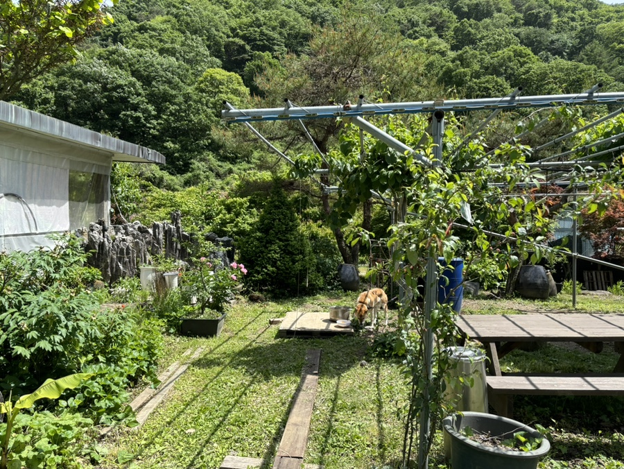 휴양림로를 따라 금산에서 대전방향으로 가는 길인 진산면에 위치해 있다. 황구가 유유자적 놀고 있다. 위에 레일을 달아놓으셔서 행동반경은 철제로 만들어진 기둥 요 끝에서 저 끝까지... 황구의 마음을 잘 알아주는 사장님이었다.