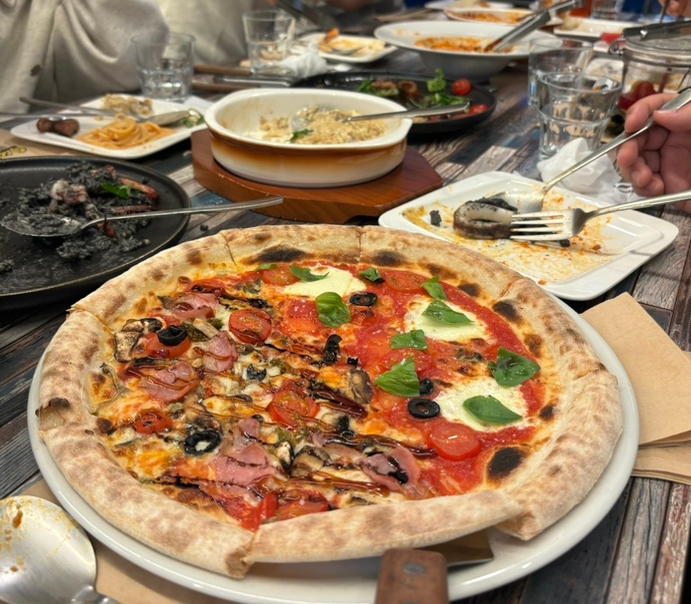 스페셜 피자로 두 가지 맛을 고를 수 있다. 디아볼라와 마르게리따를 반반 골랐다. 화덕에서 구워서 엄청 고소했다.