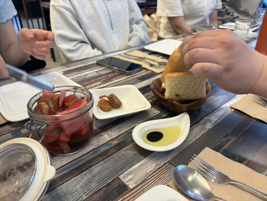 식전빵과 이 나와서 발사믹과 올리브유를 찍어먹을 수 있고, 오이피클은 먹을 수 있는 만큼 덜어먹게 되어있었다.