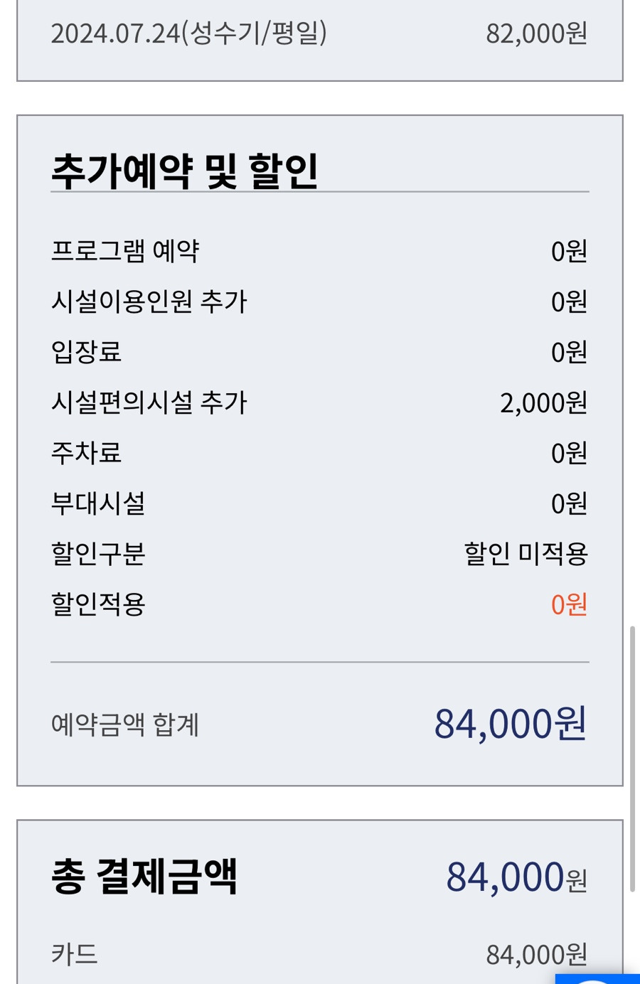 - 1박 2일에 82,000원+에어컨 사용 2,000원=총 84,000원 소요됨