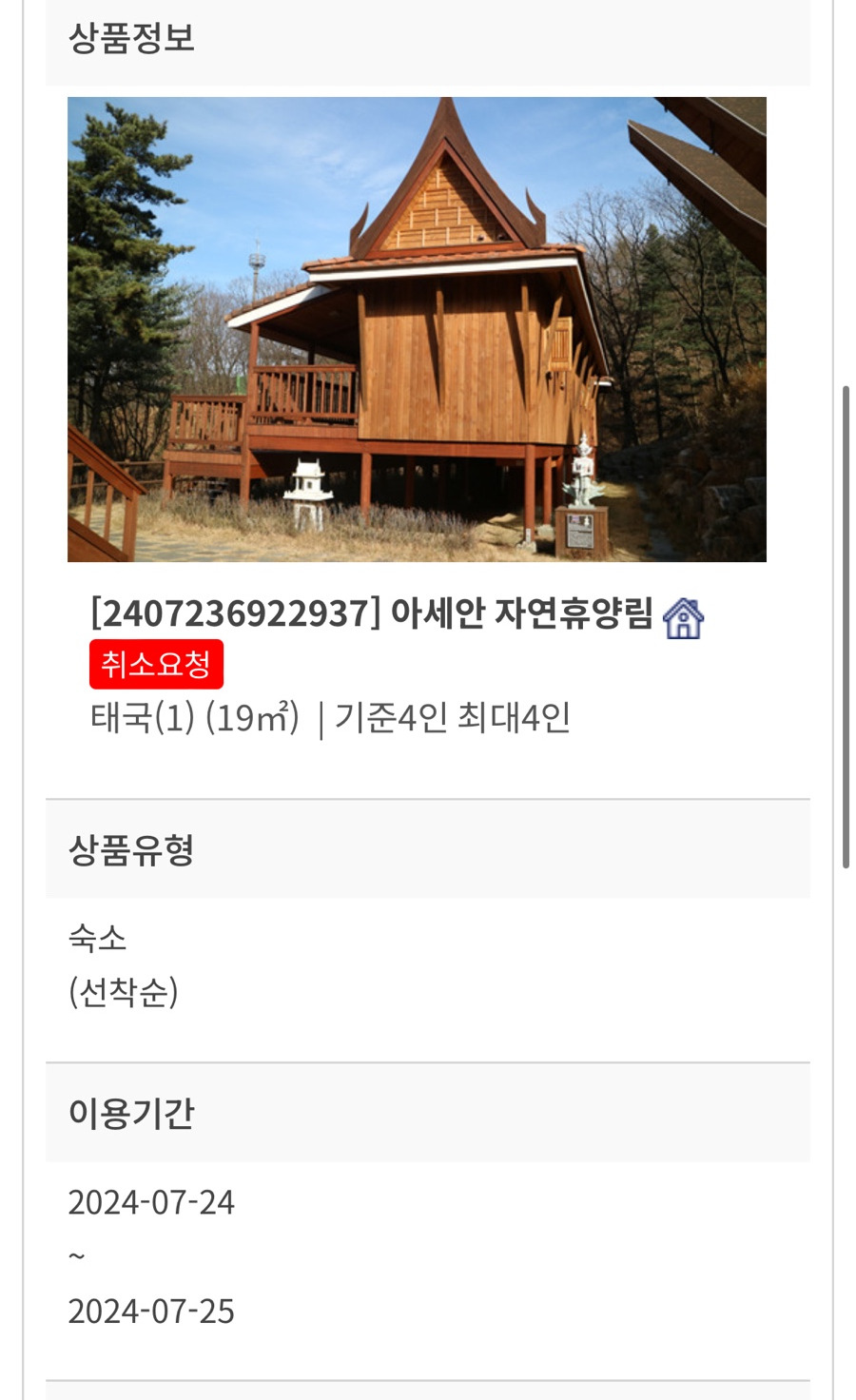 - 예약가능한 숲속의집/ 휴양관이 나온다.