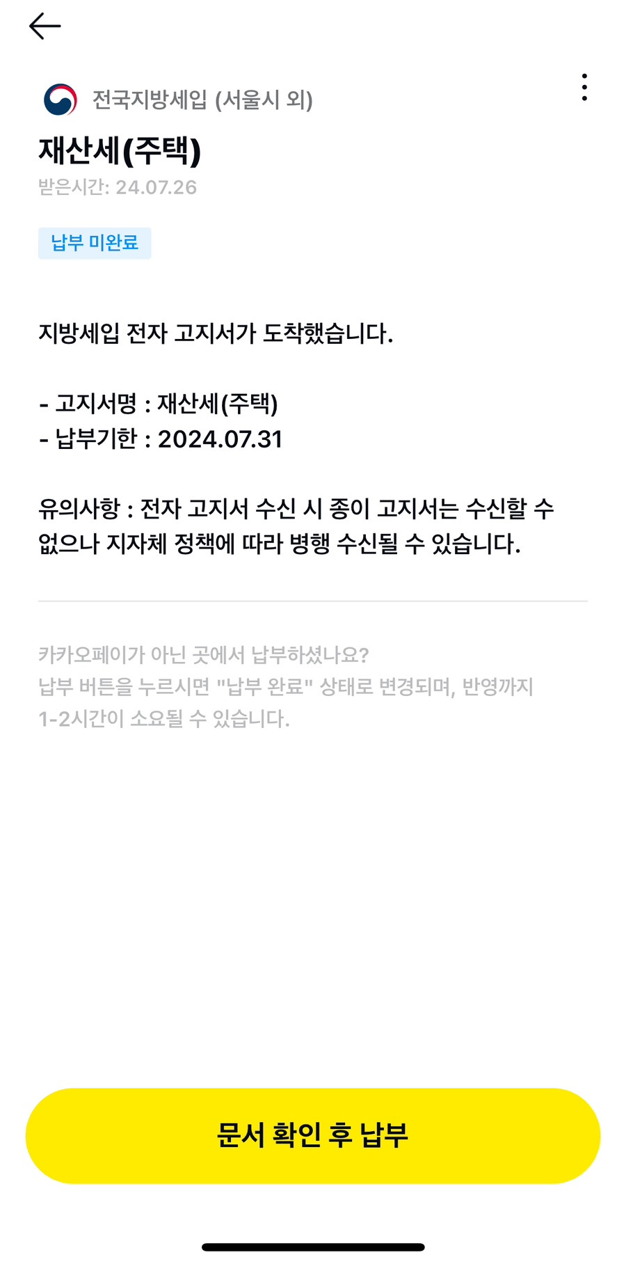 - 카카오톡으로 지방세입 전자 고지서를 신청해 두었기에 카카오페이로 결제하기가 수월했다.