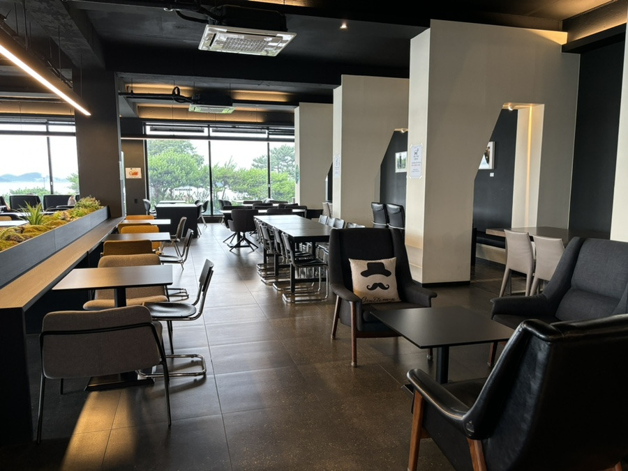 깔끔한 건물, 통창으로 바다에 둥둥 떠 있는 듯한 느낌을 주는 곳!