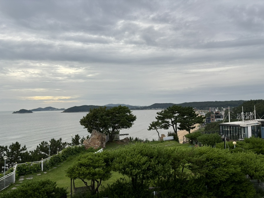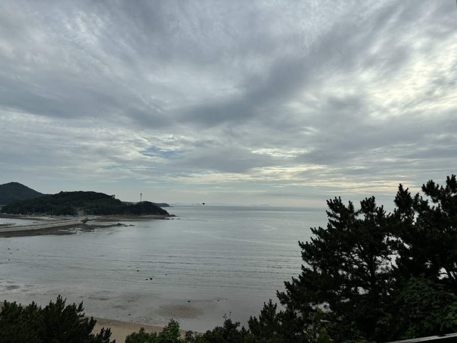 실미도가 보이는 마시안 해변 뷰, 하늘엔 비행기가 다니고 한 여름이라 습한 공기가 가득하지만 마음만은 뻥-뚫림!