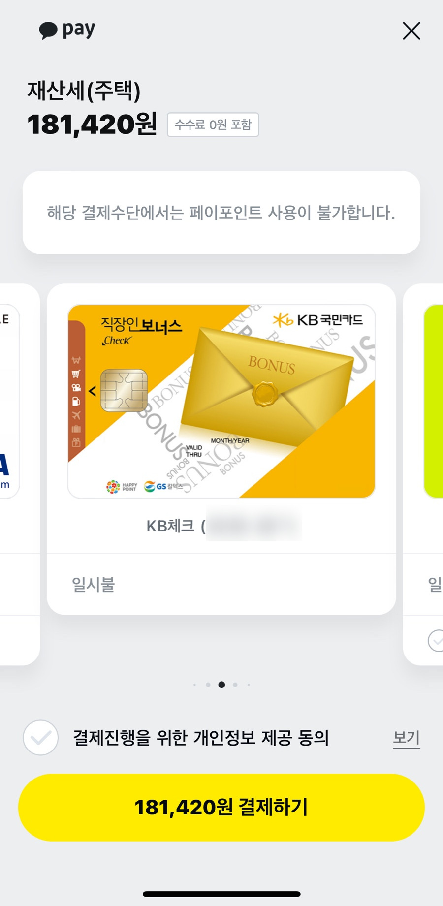 - 카카오페이에 KB직장인보너스체크카드를 등록해두어 쉽게 결제 가능
