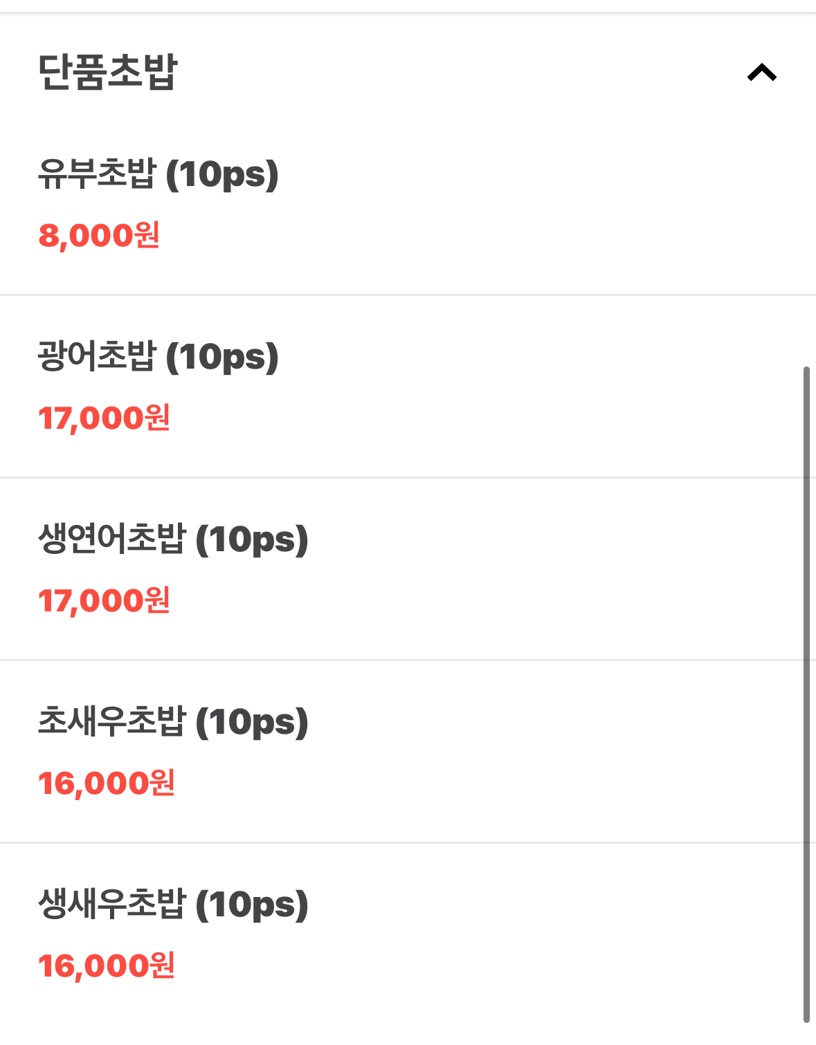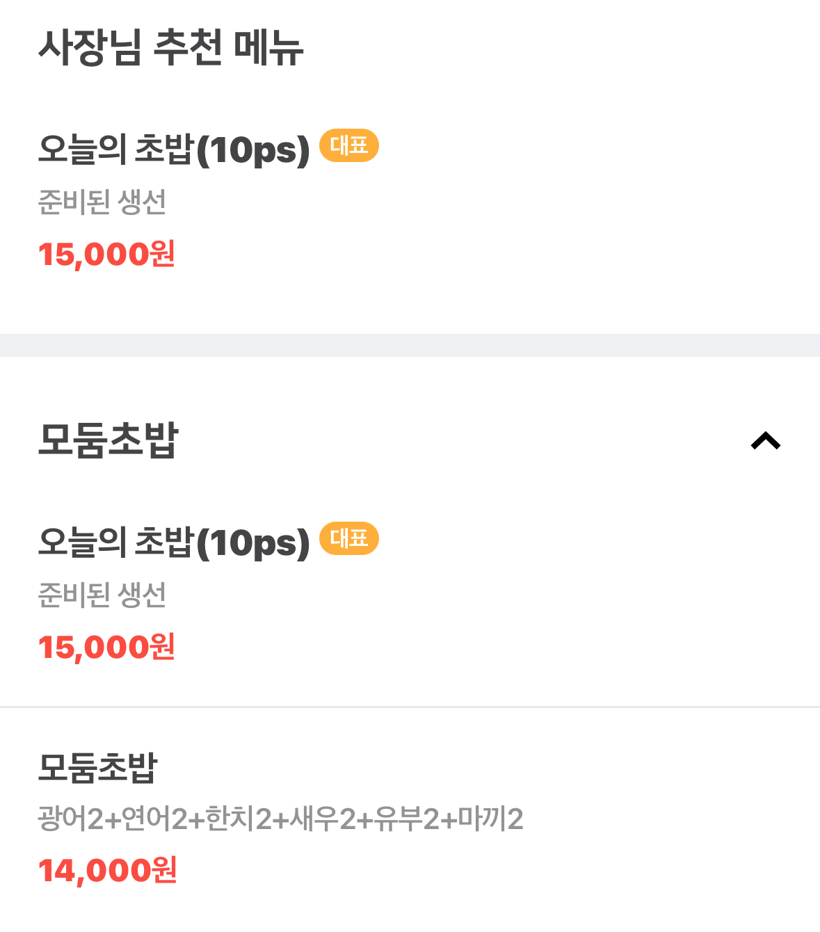가격이 진짜 착하다! 오늘의 초밥은 10피스에 15,000원! 단품을 좋아한다면 유부, 광어, 생연어, 초새우, 생새우 골라서 먹을 수 있다.