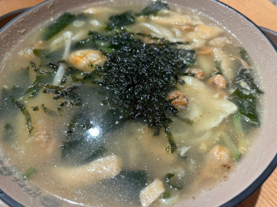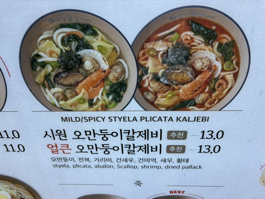 칼제비도 시원한 맛과 얼큰한 맛이 있는데, 늘시원한 맛만 먹는다. 오만둥이는 기본보다 2천 원 비싼데 해물이 많이 들어있어서 보통 이 친구를 선택하는 편이다. 오만둥이, 전복, 가리비, 건새우, 건미역, 새우, 황태가 듬뿍 들어있다.