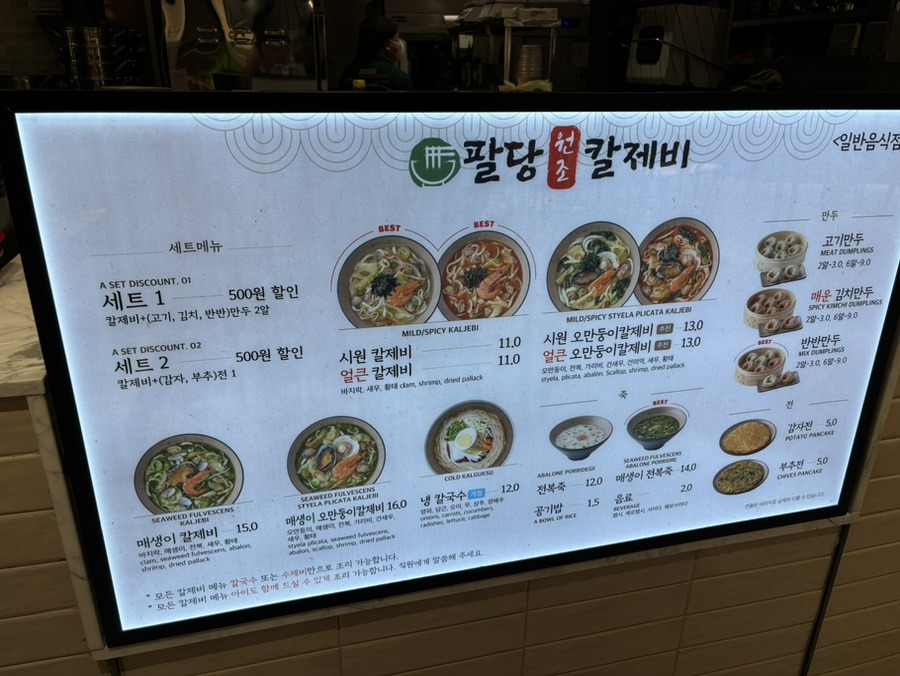푸드코트 복수분식 자리에 팔당 원조 칼제비가 들어왔다. 9월에 오픈해서 벌써 여러번 사먹었다.