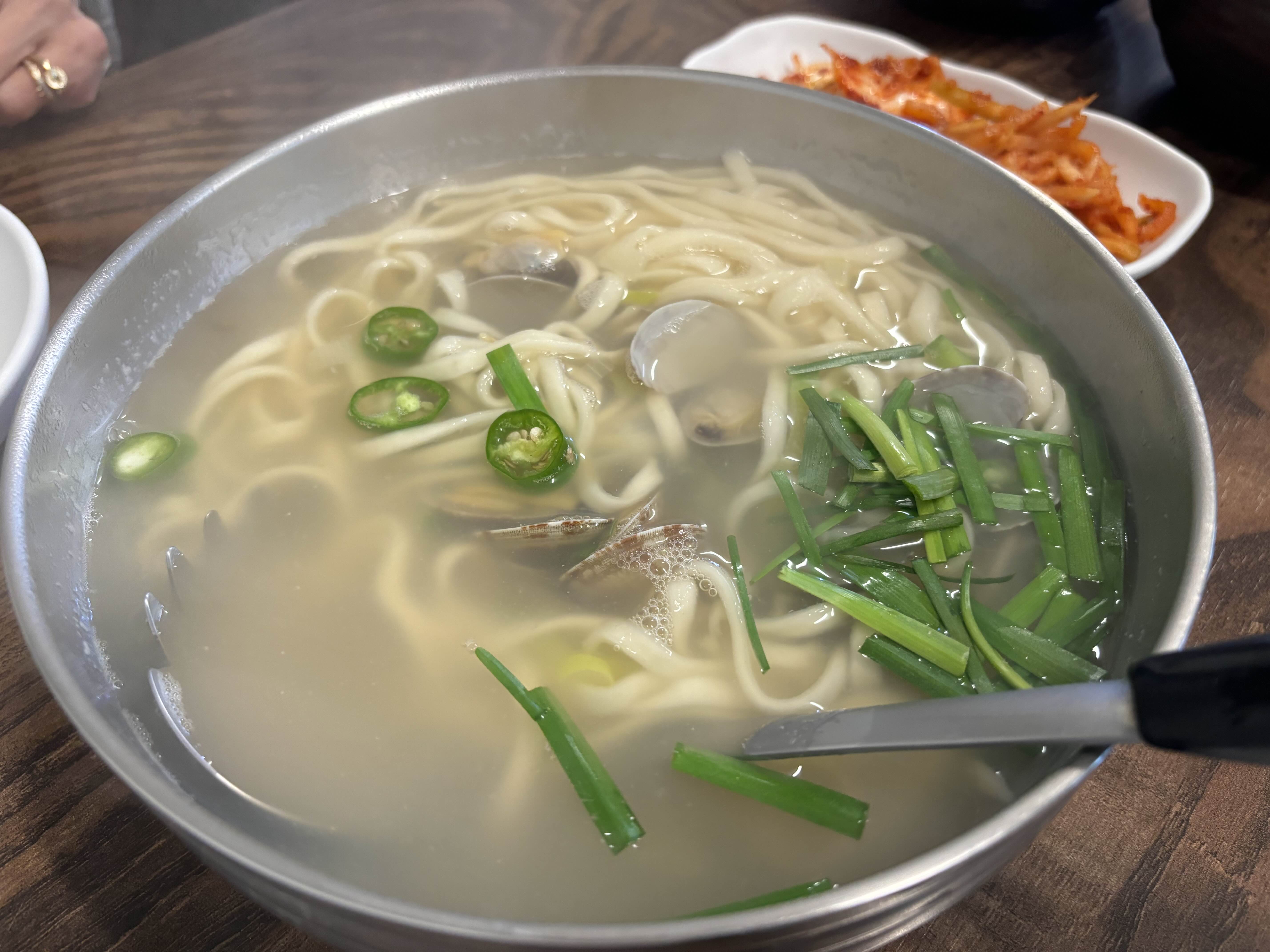먼저 바지락 손칼국수 1인분이 나왔다. 2인분 이상은 하얀 대야그릇에 나온다. 바지락이 신선하고 국물은 무척 시원하다. 부추에 몸이 따뜻해지고 눈물 흘릴 만큼은 많이 맵지 않아 청양고추도 두어 개 씹어먹었다. 채 썬 애호박도 달달함을 더했다. 손칼국수의 울퉁불퉁한 식감이랑 시원한 국물이 딱이다.