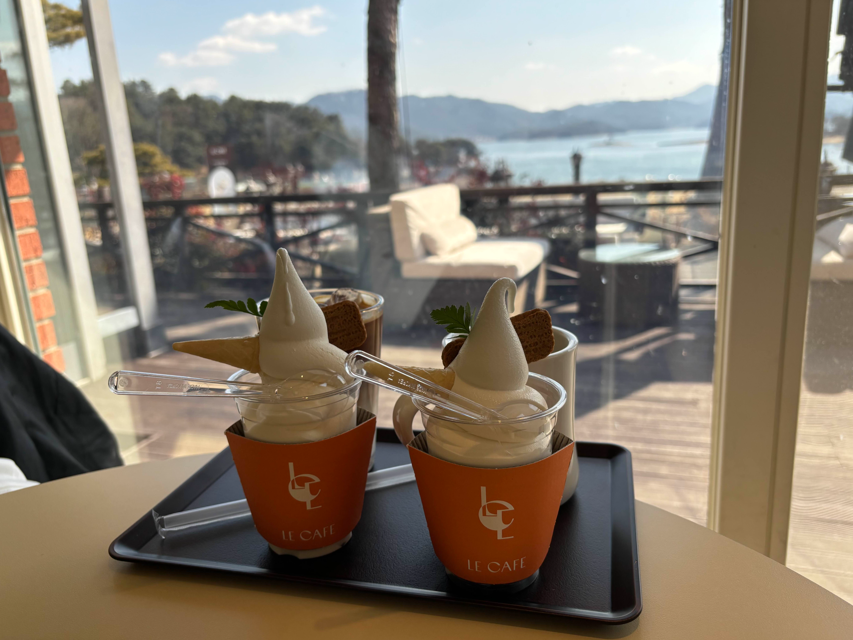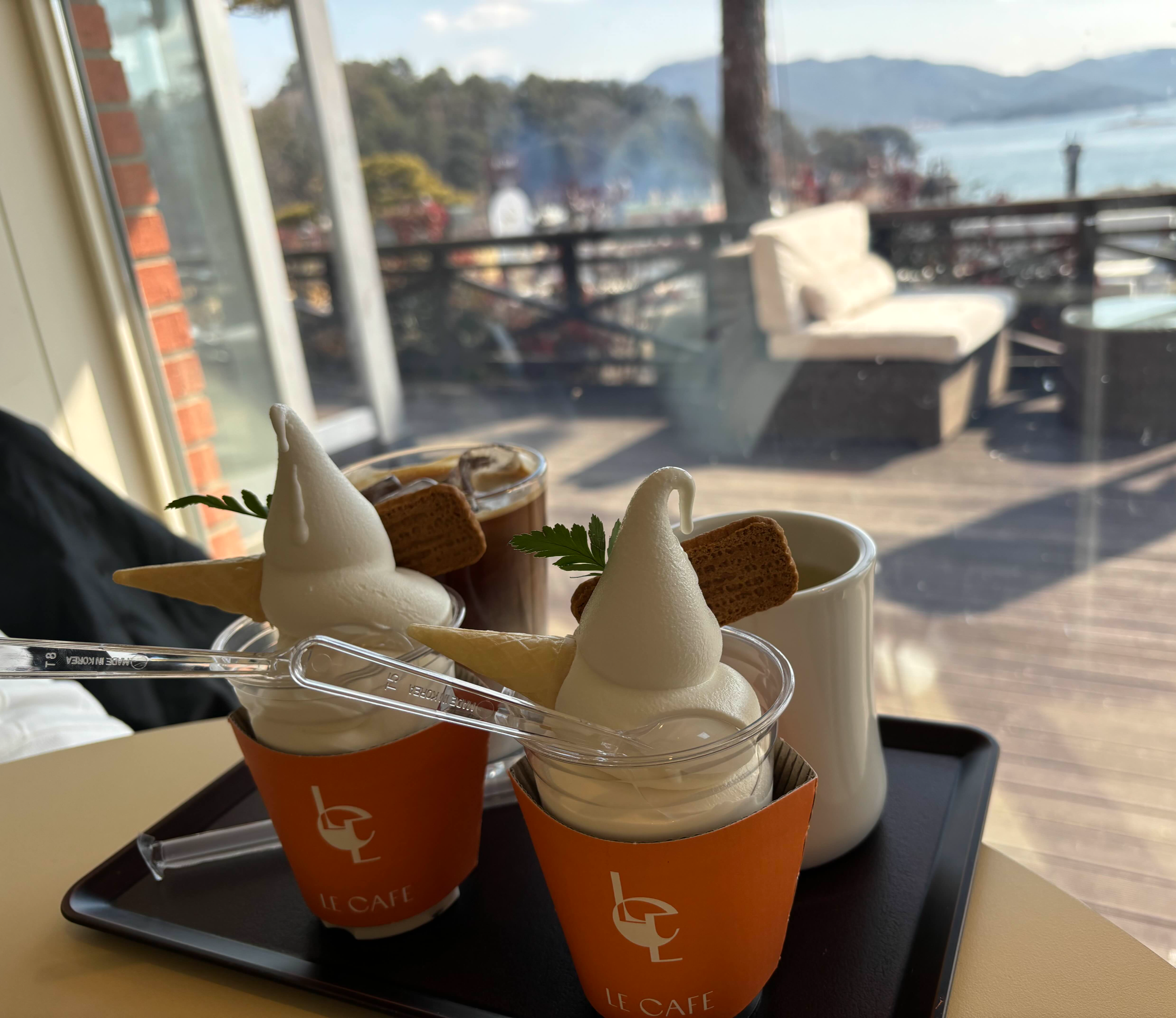 라테는 6천 원, 수제유자차는 7.5천 원, 아이스크림은 5.5천 원이다. 가격대는 있지만 호반뷰가 멋지고 내부도 깔끔한 편이라 추천! 무엇보다도 음료와 아이스크림 퀄리티가 높고 맛있었다! 데이트하기 좋은 코스라고 생각한다.