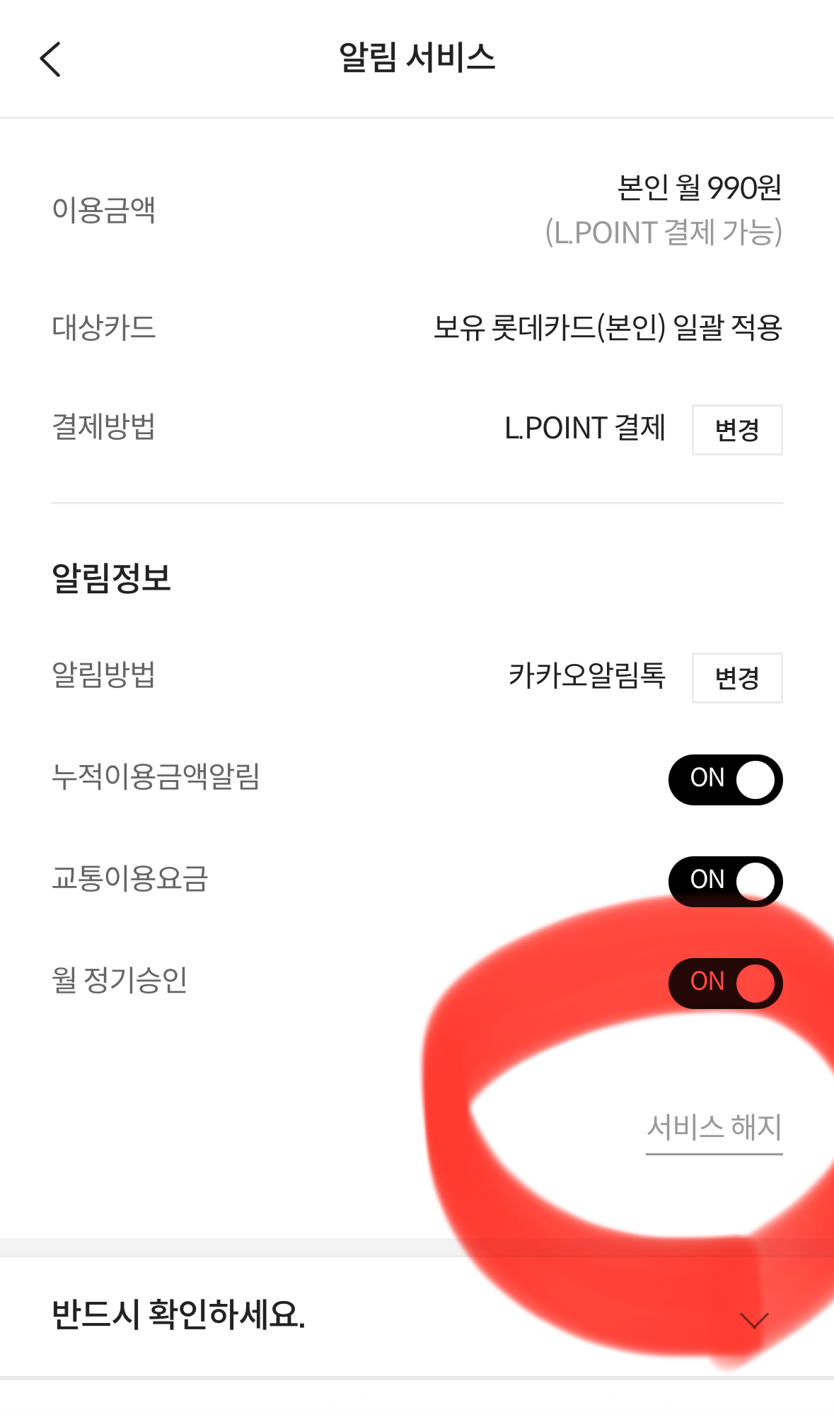 롯데카드 발급받고 3월 13일까지 무료로 크레디트케어를 사용했었는데 월 990원이 청구된다니 바로 해지! 카드 사용을 하면 얼마를 썼는지 카카오톡으로 알림 오는 것도 300원을 지불하라니까 좀 별로였다. 어플을 잘 들어가서 확인하는 것으로...! 줄줄이 새는 푼돈 막기 시작!