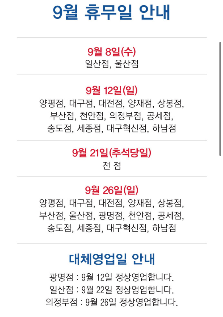 - 대전점, 세종점, 천안점, 하남점, 양평점, 상봉점, 일산점, 의정부점, 울산점, 부산점 오전 10:00 - 오후 10:00